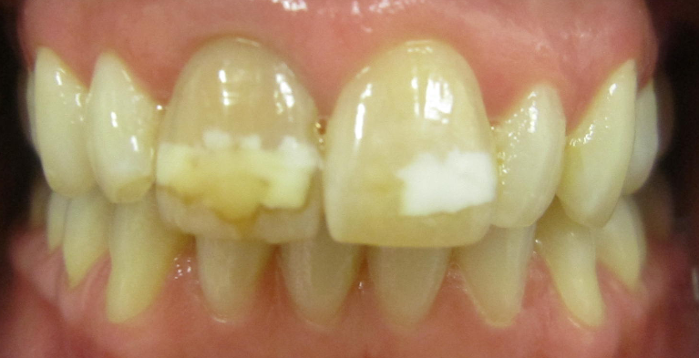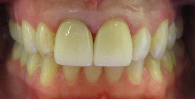 Veneers were placed for esthetics on the two upper front teeth.